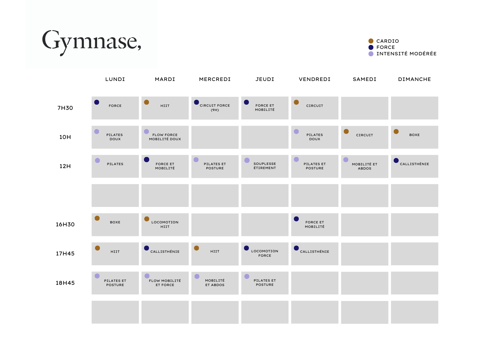 The color legend can help you find your way around. Overall, we offer three types of classes: Cardio / Strength / Moderate intensity.